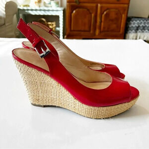 Franco Sarto Sarah Red Faux Patent Rattan Wedge Peep Toe Sandal Women’s Size 8.5