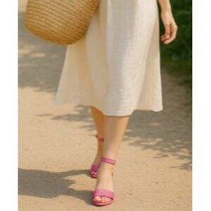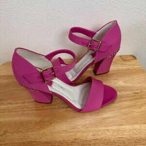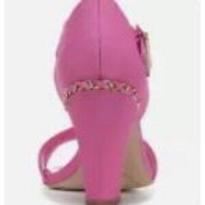 Franco Sarto shoes, pink sandals, block heel, dress sandals, women's footwear, ankle strap, gold chain detail, open toe, professional shoes, synthetic leather, designer sandals, stylish heels