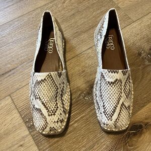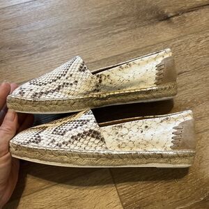 Stylish snake print espadrilles. Comfortable slip-on design. Perfect for casual wear.
