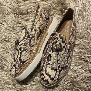 Never worn Snakeskin design Slip on Jute wrap trim Tassels on the top Woman’s 6M
