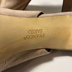 Elevate your style with these Franco Sarto suede tan leather peep toe sandals. Featuring a chunky heel, these elegant shoes are perfect for any occasion, offering both comfort and chic design.