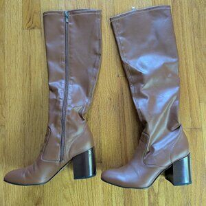 These neutral colored, vegan leather look boots have been worn a total of three to four times for a cosplay. Don't have the top to the box, but when not worn they were stored in the box in a cedar closet.