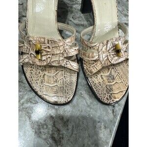 Franco Sarto Y2K is a pre-owned strappy sandal made of tan croc leather with snakeskin print. It has a low kitten heel and slip-on closure. The sandal is cushioned, lightweight, and comfortable, with leather lining and outsole. The sandal is suitable for workwear and has straps for support. The sandal is available in size 9, UK size 6.5, and EU size 40. The sandal is a vintage model and has not been personalized or customized.