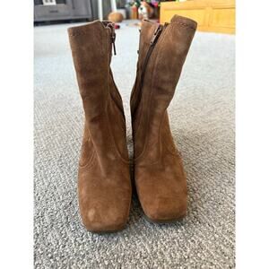 Franco Sardo’s women’s size 6 suede brown wood heeled ankle booty zipper closure one small neck in the wood side. Please see picture no no big deal at all very very lightweight and excellent condition.
