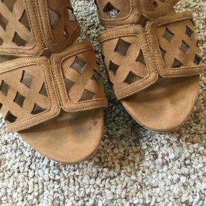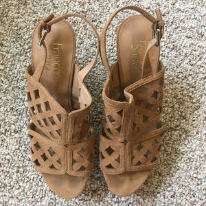 Franco Sarto Wedge Heel Clogs Size 10 Cork Tan Cut out Fabric Sandal Shoes