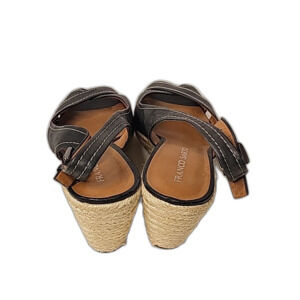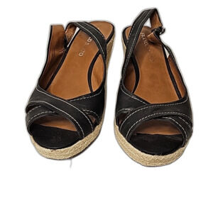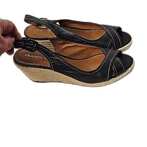 Franco Sarto Wedges Black Leather White Stitching Size 10, heel 3", some peeling on sling areas- see pictures otherwise in good condition.