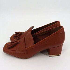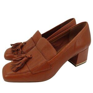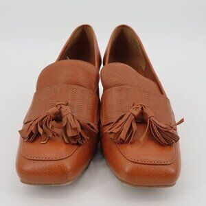 Franco Sarto Women 7.5 M ROME Cognac Brown Leather Tassel Gold Trim Loafer Heels