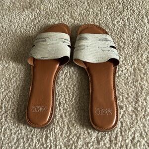 Franco Sarto A-GINELLE snake leather upper slide size 8.5, silver n grey with a hint of metallic, 0.75” heels, slip on with padded sole for comfort, balance man made, bottom has good grip. Pre loved slightly worn in excellent condition, no flaws. Great neutral to add to any outfit. Very cute! Item# 0037