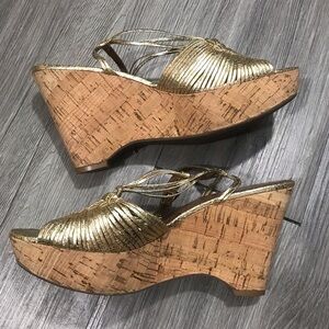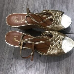 Franco Sarto Womens Gold Brown Ankle Strap Wedge Buckle Sandals Size 8.5