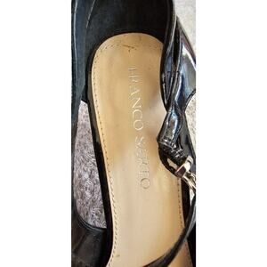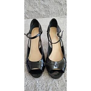 Franco Sarto Womens Black Patent Ankle Peep Toe Cork Platform Heels Pumps 10M