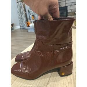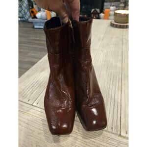 Keywords: Franco Sarto, ankle boots, leather, brown, women's boots, casual, side zipper, square toe, block heel, mid heel, gold-tone logo, comfortable, stylish, office wear, new condition.