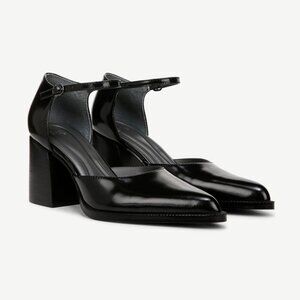 Synthetic leather made from partially recycled materials • Eco-conscious linings with soft + sustainable comfort • Metallic buckle closure Mary jane with pointed toe • 3 inch chunky block heel for comfort and stability.