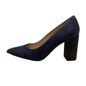 Pointed-toe block heels with leather upper and man-made balance. Navy suede finish. Size: US 9.5M. Made in China. Comes with original box.