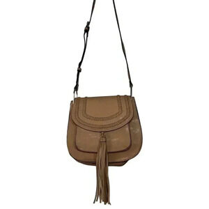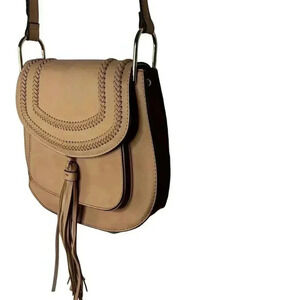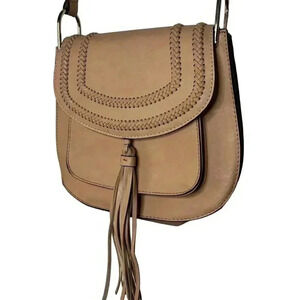Keywords: Franco Sarto, crossbody bag, tan, brown, women's bag, tassel detail, flap closure, adjustable strap, spacious interior, casual bag, pre-owned, versatile, everyday accessory, stylish handbag, functional design.