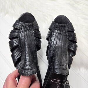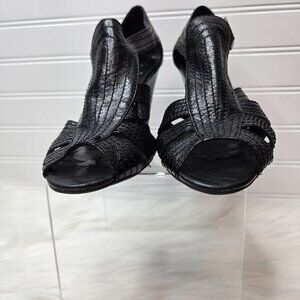 Franco Sarto Women's Size 7 M Black Leather Wedge Sandals Heels Peep Toe Buckle "A-Chess"