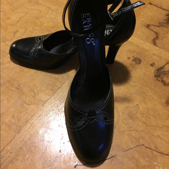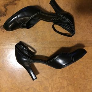 Never worn black leather Franco Sarto Mary Jane heels, 3 in w/ ankle strap.