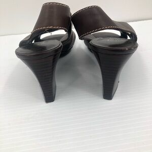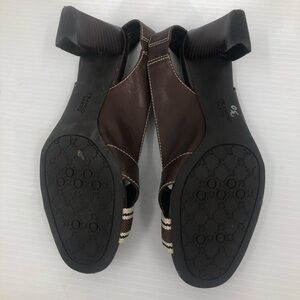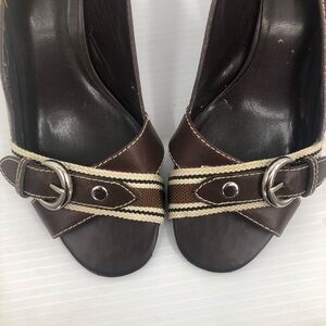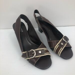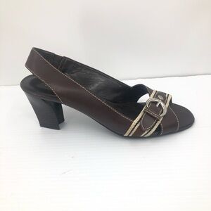 Franco Sarto women’s brown leather peep toe heels sling back buckle up closer 10M