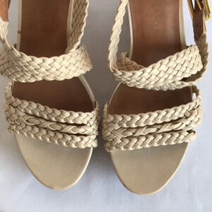 Franco Sarto cream braided platform wedge sandals, size 7.5. Good preowned condition. Ankle wrap with side buckle.3-inch cork heel. 1-inch platform at toe.