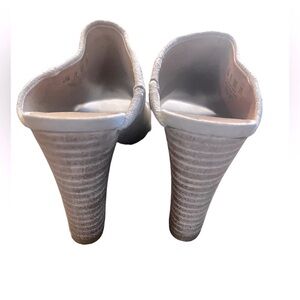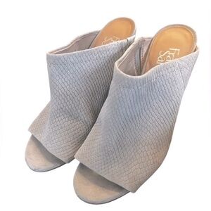 Franco Sarto heels, suede mule sandals, gray block heel slides, size 6.5 summer shoes, modern slip-on heels