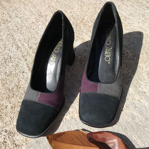 It's almost fall: time to break out the autumnal colors! These shoes are it: gorgeous plum, grey, black patchwork suede Franco Sarto Venezia square toe heels. Sexy while also being smart and fashionable. Kept in great condition. Snag these babies and get started on kicking up your fall wardrobe.