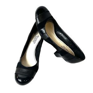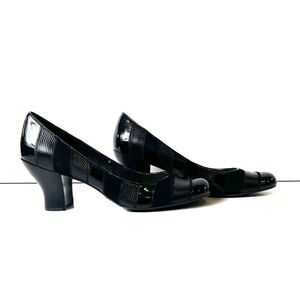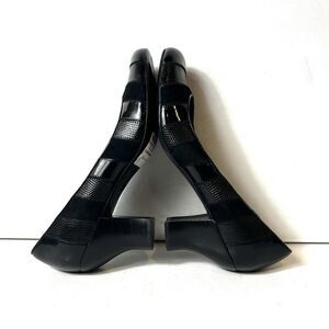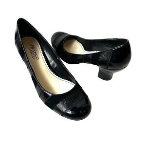 Franco Sarto Women's Size 7.5M Black Textured Leather/Patent Leather/Suede Pump Block Heel Round Toe Slip On