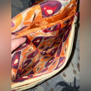 This crossbody bag from designer Franco Sarto showcases a vibrant geometric pattern in orange and red, crafted from durable fabric. Its modern design and playful aesthetic make it a standout accessory for any occasion.