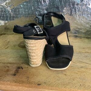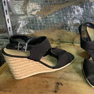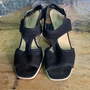 Franco Sarto black canvas open toe wedge, ankle strap with buckle. Worn a few times, light wear to bottom.