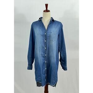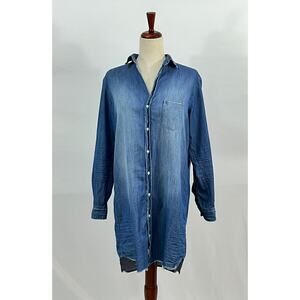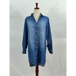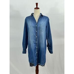 Stylish blue maxi dress. Button-down front. Long sleeves with rolled cuffs. Perfect for casual outings.