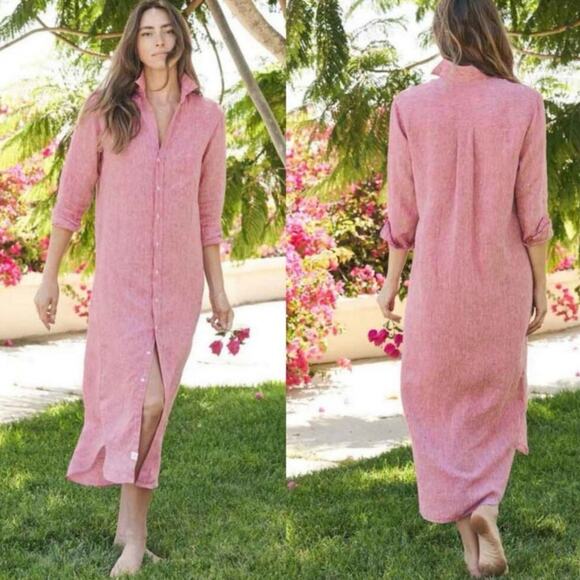 This rare, sold-out Red Lived-In Linen color offers a soft washed tone that complements every season. Features include a classic collared neckline, full button-front closure, adjustable roll sleeves, and a flattering curved shirttail hem that moves beautifully with you. The maxi length provides comfort and coverage while maintaining a chic, elongated silhouette.