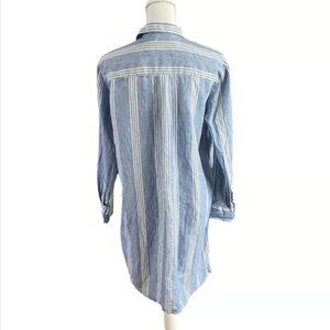 Frank & Eileen Hunter mini shirt dress. Blue with white stripes. Button front. Linen blend. Slight high low. Side slits. Size X-Small. Excellent condition with no noted flaws.