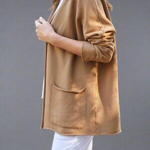 You'll want to curl up in this comfy cardigan from Frank & Eileen. Made of 100% cotton sweatshirt knit, it feels fantastic and can be styled so many ways. Loose, easy fit with rolled collar, patch pockets, and an open front. In excellent condition.