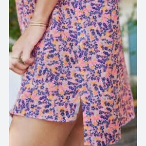 Frank & Eileen Hunter step hem classic shirt dress in linen with floral print. 100% linen shirt dress in bright pink and orange floral print. Step-hem. Signature bust flattering button placement. Long sleeves with button cuffs.