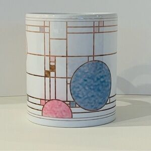 Stylish mug with geometric pink and brown design. Perfect for coffee or tea lovers. Mug depicts the stained glass window at the Coonley Playhouse designed by the iconic architect Frank Lloyd Wright. Mug has some fading due to aging but pastels and design are still beautiful. No crack, chips or flaws.