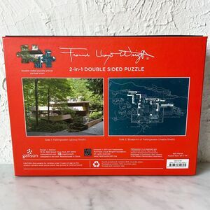 Frank Lloyd Wright Fallingwater double sided jigsaw puzzle is complete and in excellent condition. Two-in-one puzzle has a photograph of Falllingwater (glossy finish) on one side and the other side has the blueprint (matte finish). 500 pieces. 24 in x 18 in. We put puzzles together before reselling to ensure they are complete. Pieces stored in resealable bag. Please see the pictures for all the details.