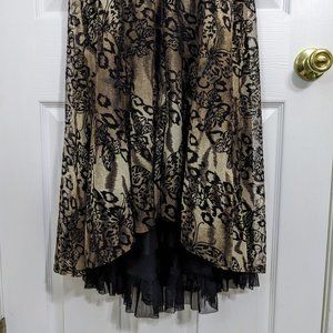 Looking for a dress that will take your breath away? Check out the Frank Lyman Design Hi-Lo Dress! With the tan and bronze glitter color, you'll feel like a goddess. The black-flocked butterflies and animal print will make you stand out in any crowd. The halter neckline and criss-cross back will accentuate your curves, and the zipper back closure will give you the perfect fit. The long calf length and ruffle hem will make you feel elegant and stylish. Get ready to turn heads with this beauty!