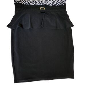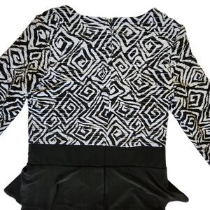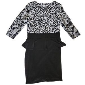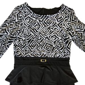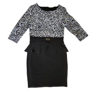 Brand: Frank Lyman Design. Occasion: Casual. Semi-formal. Semi-casual. Business. Office. Night out. Cocktail. Any. Size Type: Regular. Size (Women's): 10. Material: Polyester and elastane blend. Neckline: Round neck. Style: Cocktail dress. Sleeve Length: 3/4 sleeve. Color: Black. White. Pattern: Geometric. Solid. Mixed media. Features: Peplum skirt bottom. Decorative belt with a gold-toned buckle (not removable. decoration only.). Back zipper closure. Lined. Sequins on the top portion.