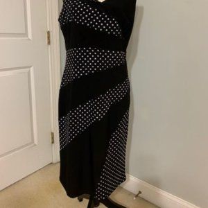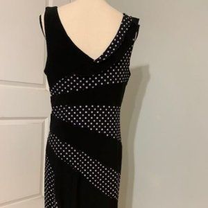 Fun, easy fitting, cocktail dress. One shoulder has added layering, other shoulder is plain. Both back and front of dress have V-shaped neckline. Soft, comfortable material with slight give. Bottom of dress is very slightly flared (not straight), making this a very easy, comfortable dress. Waist approx 32", Length (from arm pit to hem) 32".