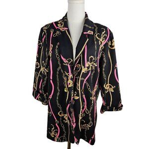 tags; Frank Lyman, crepe knit, collared jacket, size 18, black pink, chain pattern, professional wear, Canada made, office wear, travel, party, cocktail, workwear, business, professional blazer, career