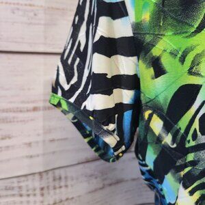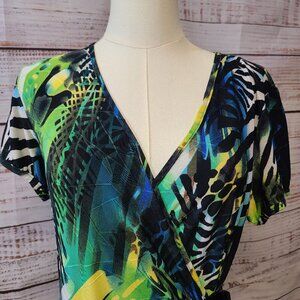 An unforgettable Y2K-era wrap dress from Frank Lyman—made for turning heads. This bold beauty features a wild jungle print in deep blue, electric green, and neon yellow with zebra and reptile patterns tangled together in true early-2000s fashion.