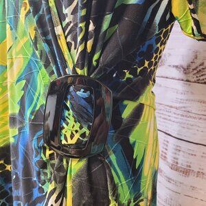 The stretchy, slinky fabric hugs and drapes in all the right places, anchored by a dramatic black buckle at the waist. It's giving “vacation diva” and “night out in Miami” all at once. Effortless stretch with movement. It is so flattering. Shown on a petite mannequin for photography, but will fit a range of sizes, up to and including large or more, depending on desired fit.