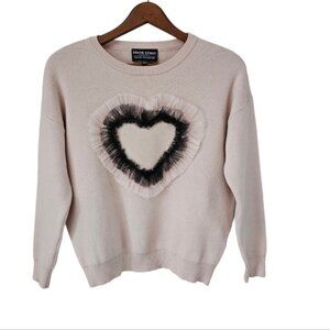 Frank Lyman Montreal soft knit sweater beige with the sheer trim heart detailing Mark is XSbut it can look very good on the small