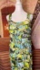 This stunning sleeveless features a vibrant yellow hue with ruffled, tiered layers that add movement and texture. The spaghetti straps and flowing fabric make it perfect for a cocktail event or a night out. Its artistic print pattern enhances its summery and elegant appeal.