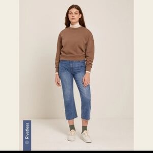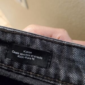 Frank & Oak Karen Jeans. High rise. Cropped legs with flare opening. Ankle boyfriend fit. Frayed raw hem. Non stretch denim. Very in trend.