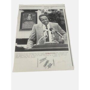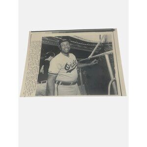 Vintage press wire photos featuring Frank Robinson, Hall of Famer & Baltimore Orioles manager. Historical memorabilia for baseball enthusiasts. Both photos are from the 1970s. One is of his Hall of Fame induction and the other is of him as the manager of the Baltimore Orioles.