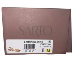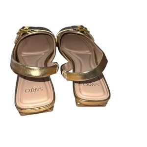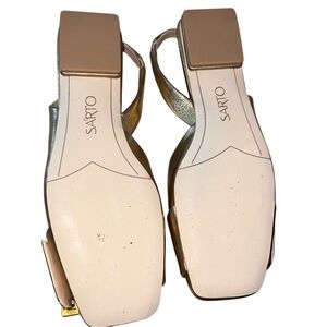 Frank Sarto Tracy Slingback Square Toe Flats size 8 gold new in box. They were tried on but I never wore them. They are this years style and still sold. Very comfortable cushion sole. Fit true to size.