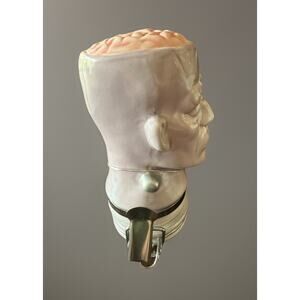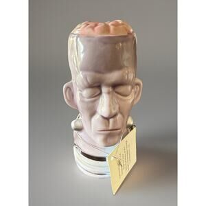 New open box because I opened it to take the photos otherwise new, is an airtight container decorative or for storage Frankenstein. Frankenstein stands approximately 4 1/2 inches high is lavender in color ( the pictures don’t show the true lavender muted purple) with his pink brain and silver colored neck bolts. Great for Halloween decoration perfect for the Frankenstein fan or use it as a airtight container sold as shown please see all photos