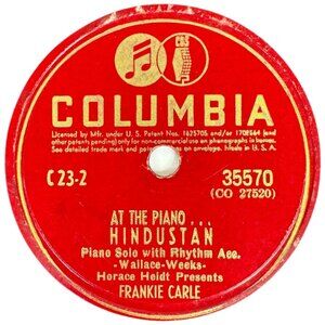 Frankie Carle performs piano solos, including "A Lover's Lullaby," "Sunrise Serenade," and "Hindustan," on Columbia 78 RPM record catalog 35570.