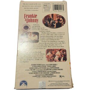 The product is a VHS tape of the 1992 comedy "Frankie and Johnny" starring Al Pacino and Michelle Pfeiffer. Directed by Garry K. Marshall, this movie follows the story of a negligent father who, in the wake of his daughter's death, struggles to reconnect with his estranged son. The VHS is in English language with NTSC signal standard, and has a rating of R. This former rental from Paramount Studios offers viewers a classic comedy performance from Al Pacino in a heartfelt coming-of-age story.