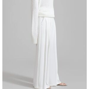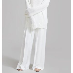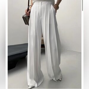Size small. Please note that is a small area where there is some pulling on the fabric. See photos attached. You can only see it when you look close up. Sizing tag is no longer on the pants. Color: White Lightweight fluid fabric Relaxed fit Mid rise Wide leg Front pleats Slant hip pockets Front button closure Zip fly Partially lined S: Waist 68cm / 26.75in Hip 108cm / 42.5in Rise 29cm / 11.5in Inseam 78cm / 30.75in