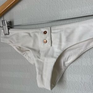 The Alana Bikini Bottom by Frankies Bikinis in White. Flirty cheeky bottoms with button front detail in luxe rib fabric. Hipster fit and center back seam that hugs curves in all the right places. Preowned with faint marks at back and some scratches in buttons. Measurements in photos.